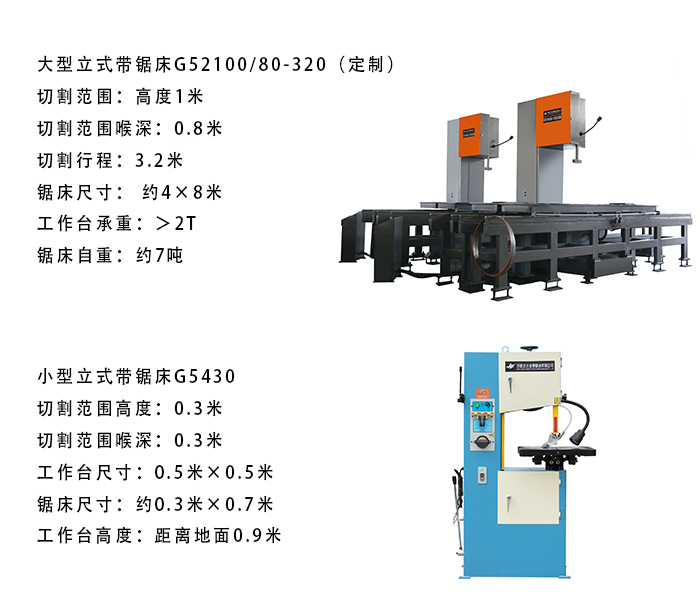 立式带锯床可锯切各种金属、非金属工件,例如金属管材、棒料、方料、钢胚、不锈钢、碳钢、铝材、石墨、橡胶、皮革甚至风干肉等无数种材料,锯床能完成各种直线、波线、角度、花样切割。大型立式带锯床的承重大、切割范围大、占地面积大;,小型立式带锯床占地小、便移动、切割范围小,两种立式带锯床的区别如图下所示: