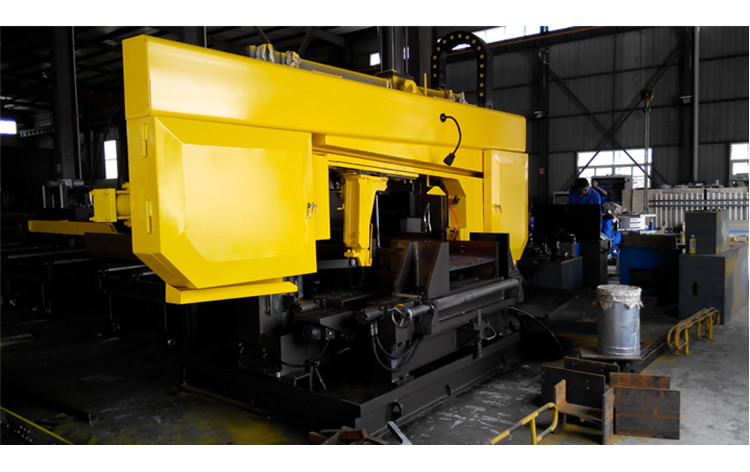 金锋锯业H型钢专切大型角度带锯床型号有BS1000带锯床和BS1250带锯床。锯切角度为0°到-45°,锯床为半自动系统,锯切平稳、精度高。锯床具有合理的锯带导向装置,能有效延长锯带使用寿命。搭配大行程电动辊轮料架可快速实现工件移动和定位,减少工人劳动强度,有效提升工作效率。双抬升缸设计,搭配稳固的龙门直线导轨结构,锯切高效稳定。锯床传动部件精密平衡校正,能有效减少震动,独特的液压系统设计,下降速度平稳,防止锯条非正常破坏,达到理想锯切效果。